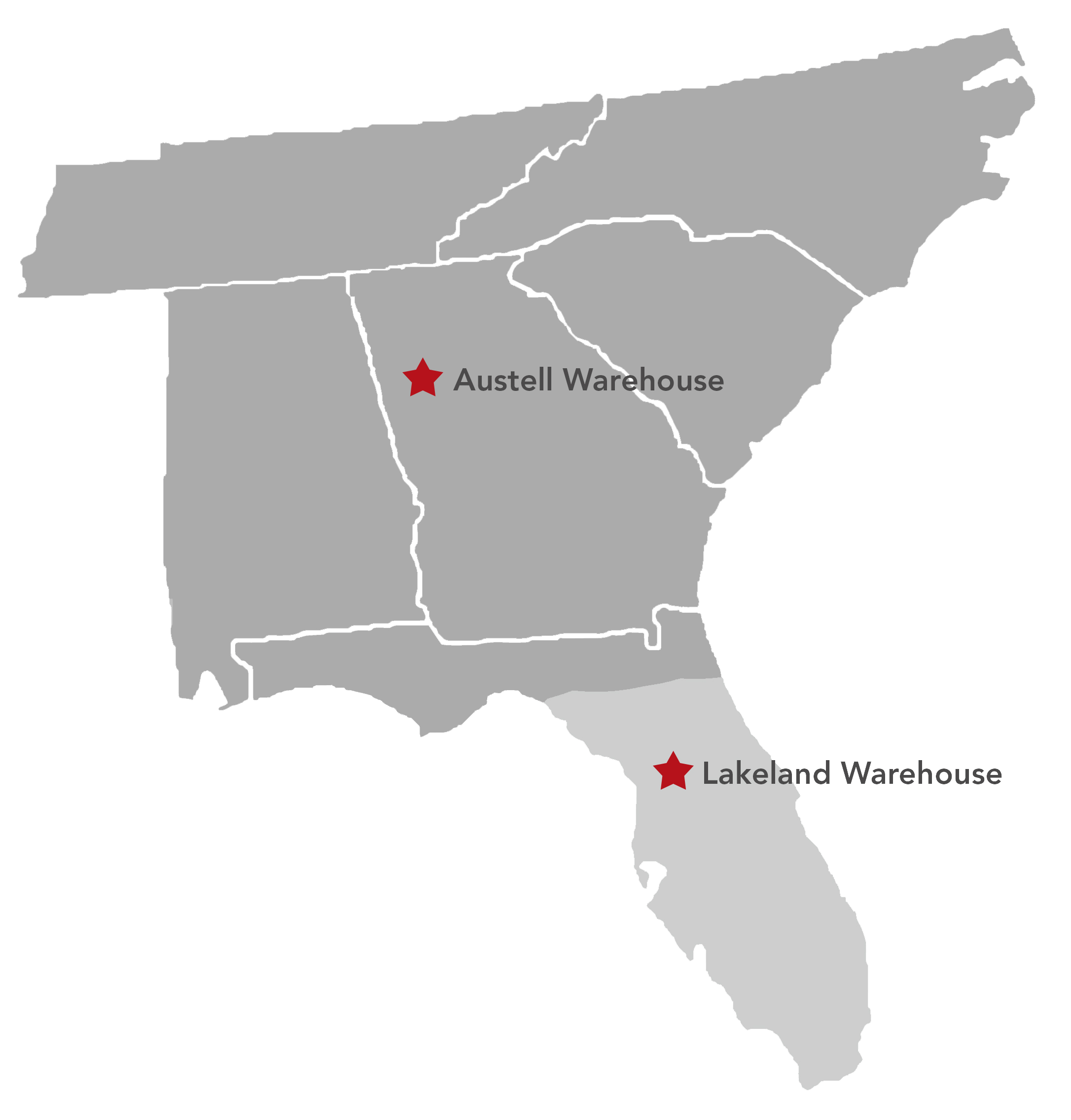 Two conveniently located distribution centers (Austell, GA & Lakeland, FL) servicing the six southeastern states of Alabama, Florida, Georgia, North Carolina, South Carolina & Tennessee.